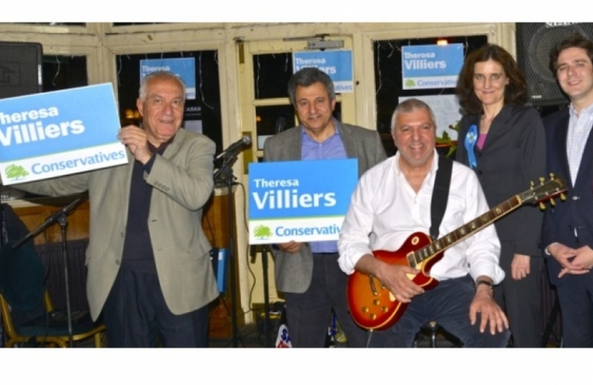 On the eve of the launch of the Conservative manifesto, Theresa Villiers, Conservative candidate for Chipping Barnet, attended an event hosted by members of the Greek Cypriot community. The evening of music was held at the Cypriot-owned Cavalier pub, in Russell Lane N20, and the renowned musician, Nikos Savvides, sang many songs about Cyprus and reminisced about life in Famagusta before the 1974 invasion.